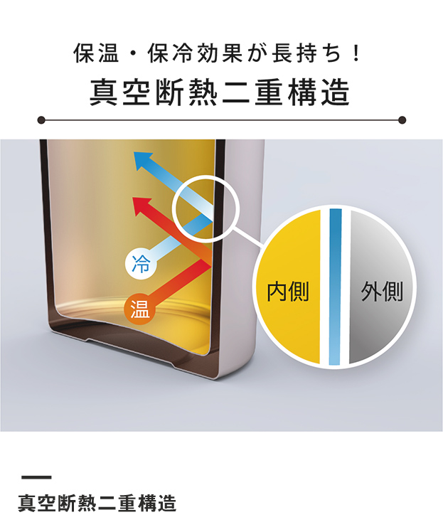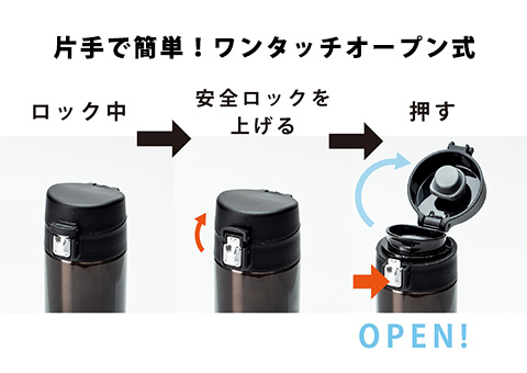 蓋を開けたら直ぐに飲むことが可能な安全ロック付きのワンタッチタイプのマグボトルになります。当商品は汚れの目立たないブラックと落ち着きのあるレッドの2種類があり保温・保冷力が高く淹れたての温度をキープする魔法瓶構造なので年間を通してご活用して頂けます。地域のスポーツチームグッズ作成やジムやフィットネスクラブの入会特典に。