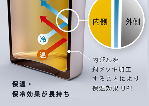 温かい物は温かく冷たい物は冷たく、入れた時の温度を保つ真空断熱二重構造になり内びんに銅メッキ加工がされているので保温効果が更にUPしています。ブラックで統一されたシックなステンレスボトルにはプリントするデザイン次第で女性らしくも男性らしくもなりオリジナル性が高く仕上がります。