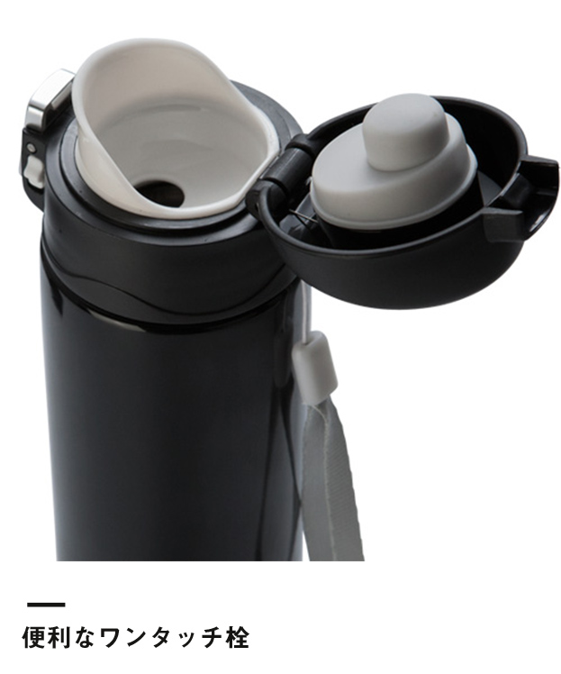 「ワンタッチスリムボトル(260ml)」は開閉が簡単なワンタッチのステンレスボトルになり、保冷温の効果が持続する真空二重構造なので機能性も抜群です。260mlと出勤や通学後の一息つきたい時や昼のブレイクタイムに最適な量です。サマーキャンペーンや販促イベントなどに役立つノベルティ制作にオススメです。