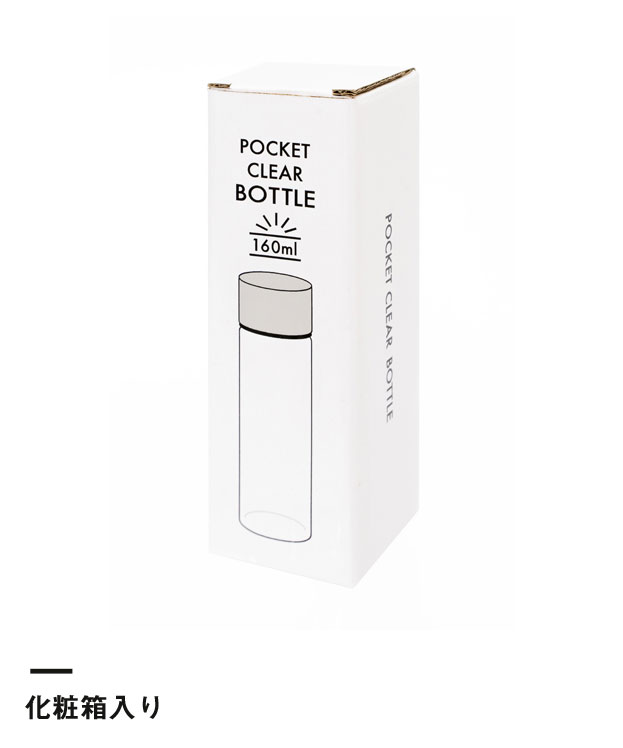 持ち歩きに最適な飲み切り容量の「ポケットクリアボトル160ml」。衣類のポケットや小さな鞄にも入る極小サイズで、ちょっとしたお散歩や水分補給にお薦めです。中身が見えるクリアボトルは、紅茶やコーヒーなどを入れるキャニスターとして使用してもおしゃれ。通販ならではの激安価格でご注文が可能ですので、ブランドロゴ入りの購入ノベルティや展示会などの来場記念品にご活用ください。