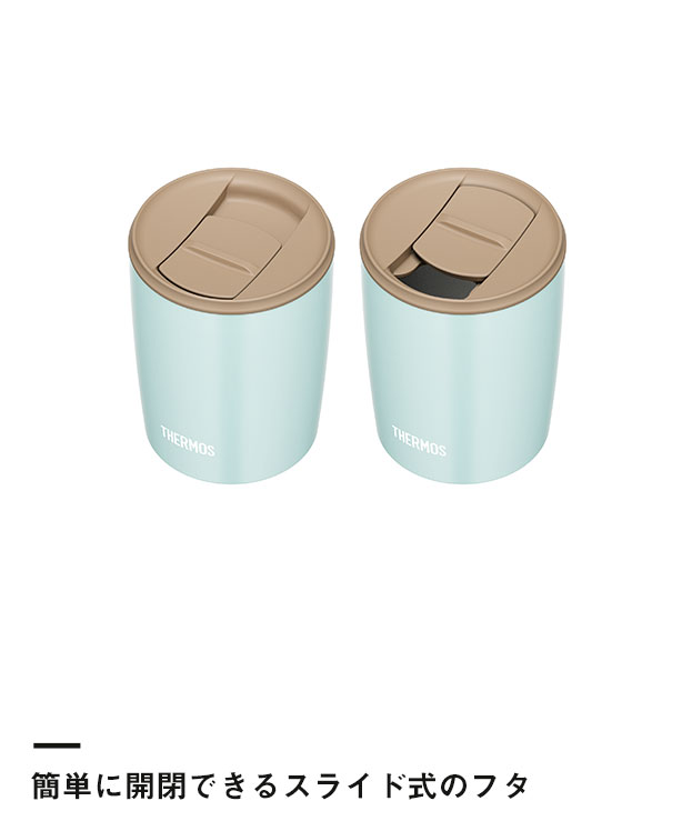 「サーモス 真空断熱タンブラー 300ml」は、保冷・保温効果に優れた真空断熱構造のタンブラー。そのまま飲めるスライド式のフタ付で、より温かさをキープし、ほこりも防ぐことができます。シンプル構造で洗いやすく、食洗器OKなのでお手入れも楽々。300mlのコンパクトサイズでデスク使用にも最適です。イベント記念品などの特注制作にぜひご活用ください。