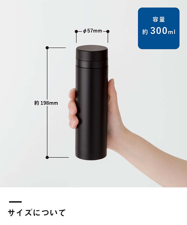 真空二重構造のステンレスボトルなので、保冷・保温効果が長時間持続する「スリムサーモステンレスボトル 300ml」。小さすぎず大きすぎない300ml容量で、通勤通学にも持ち歩きやすいアイテムです。氷が飛び出ない内ブタ付きで、フタ部分のパーツは分解して洗えるなど使い勝手も抜群。企業ロゴやチームロゴなどをプリントして、オリジナル販売グッズやノベルティ作成にいかがでしょうか。