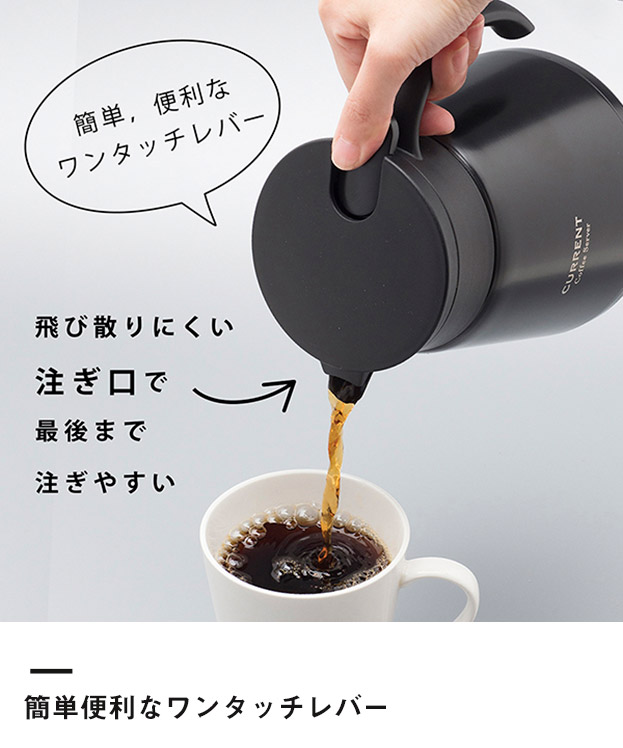 「アトラス CURRENT コーヒーサーバー 600ml」は、直接ドリップできるのが便利な真空断熱二重構造のコーヒーサーバー。各社ドリッパーが安定して乗る設計で、ドリップを終えたら蓋をして保温できます。氷を入れやすい広口口径でアイスコーヒーにも◎。コーヒー2~5杯分程度となるコンパクト商品で、格安かつおしゃれな記念品、キャンペーングッズ製作にお薦めです。