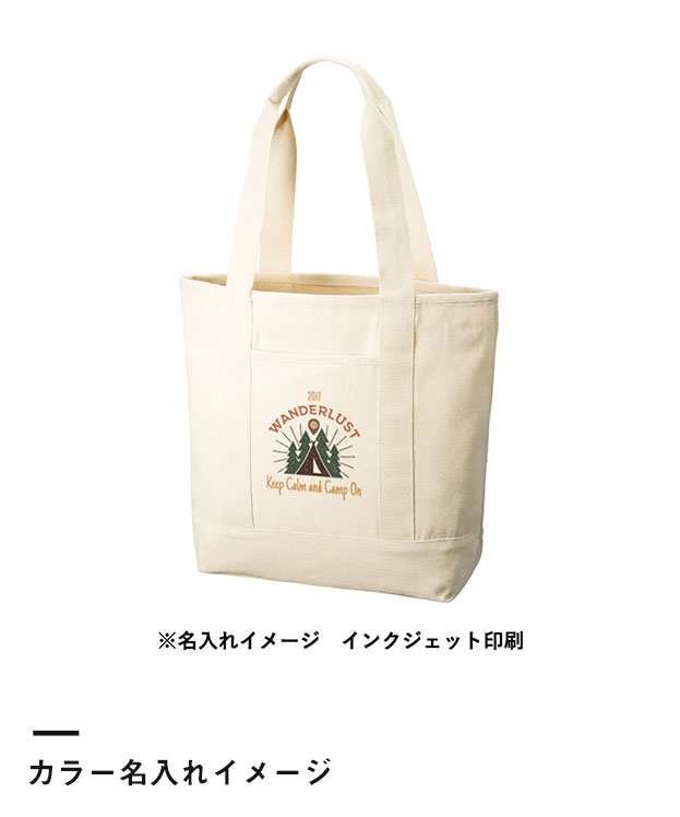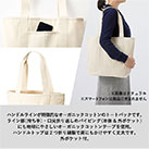 ハンドルラインが印象的な「オーガニックコットンキャンバスライントート」。スマホなどを収納できる外ポケット付きで、デザイン性と実用性の高いバッグです。環境問題に配慮したオーガニックコットン素材を使用しており、エコ関連のキャンペーンやオーガニックショップのグッズ制作には特にお薦め。ロゴやイラストの格安名入れはお任せください。