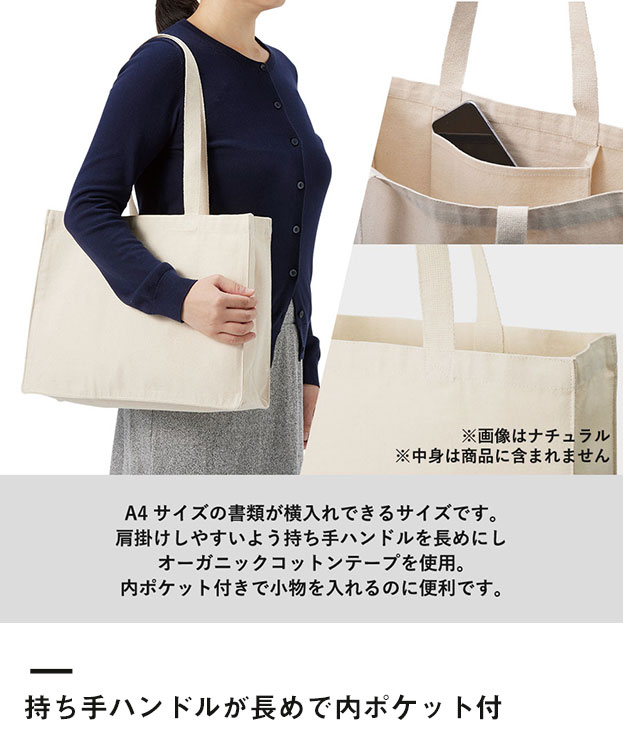 肩掛けしやすい長めのハンドルと、書類を入れやすいボックス形状が魅力の「オーガニックコットンキャンバスボックストート」。内ポケット付きでスマホなどを小分けに収納できます。環境に優しいオーガニックコットンを使用しており、キャンペーングッズや販売品として取り入れることでエコ活動の貢献に繋がります。シンプルなデザインで名入れが映えますので、ロゴなどのプリントをぜひご利用ください。