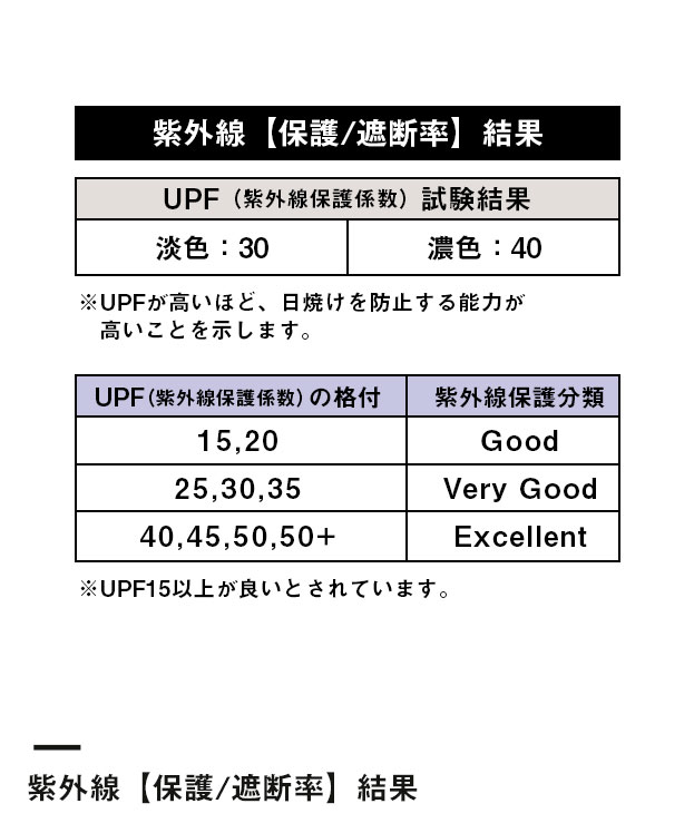 - 紫外線遮蔽率:【淡色】95%以上、【濃色】95%以上