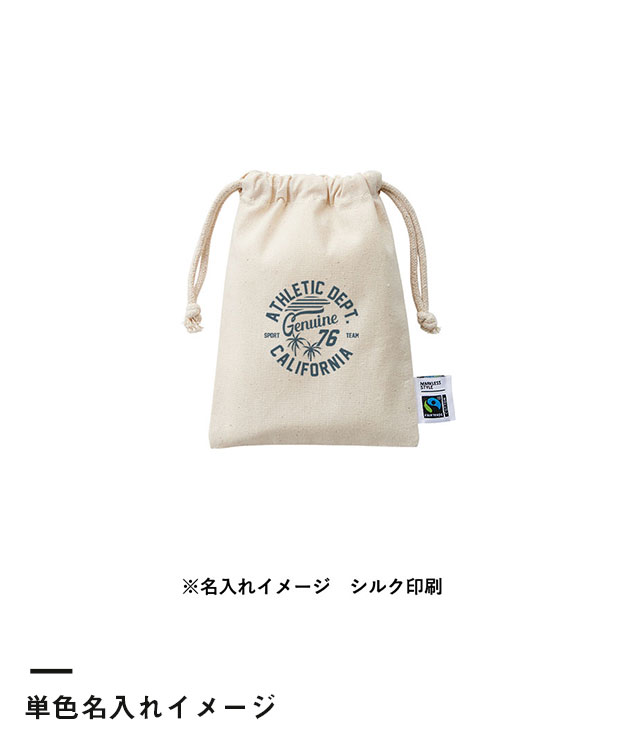 「フェアトレードコットン巾着(S)」は、全ての素材にフェアトレード認証のオーガニックコットンを使用したエコ巾着。モバイルバッテリーや化粧品小物、ポケットサイズのミニボトルなどを収納することが可能です。デイリーバッグに入れて持ち歩きやすい格安商品となりますので、イラストやロゴ入りのイベントノベルティやエコ関連キャンペーングッズなどのオリジナル作成にいかがでしょうか。