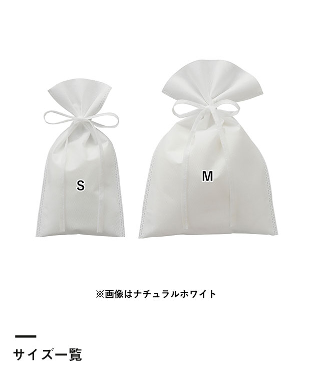 「不織布ラッピング巾着(M)」は、300mlボトルやフォトフレーム、記念品タオルなども入る大きめの不織布巾着。紐をリボンのように結べるのでギフト感を演出でき、店舗のギフトラッピングや記念品の梱包にお薦めです。コットン巾着と比べて価格が安く、大ロットのご注文にも最適。店舗ロゴなどの名入れをぜひご活用ください。