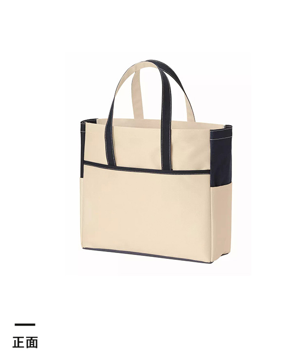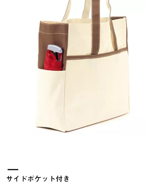 ちらっと見えるカラーがオシャレなトートバッグ、「コンビカラートート」。マチが広くしっかりとした生地が特徴のバッグで、サイドには折りたたみ傘やペットボトルが収納できるポケット付き。荷物が多いときにも便利です。名入れプリント可能範囲が大きく、名入れが目立つのも嬉しいポイントです。アパレル店の購入特典でお渡しするノベルティとしていかがでしょうか。