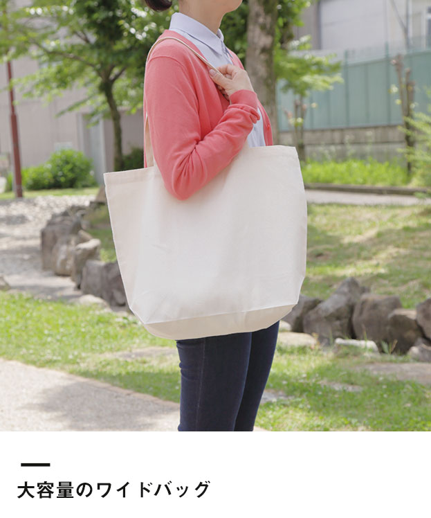 「リサイクルコットンワイドバッグ」は、リサイクルコットン使用のエコを意識したトートバッグ。底マチも付いているタイプで、たくさん物を入れることができます。企業のノベルティグッズとして活用すれば、環境保全活動のアピールにもなります。当通販ショップで格安名入れ印刷注文し、各種イベントの来場者へ配布するバラマキノベルティ制作がおすすめ。