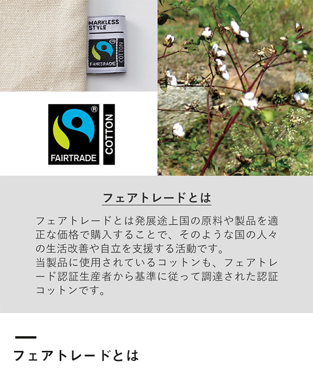 内ポケット付きが便利で、10オンスの厚みも頼もしい「フェアトレードコットンキャンバストート(L)内ポケット」。大きなLサイズは肩掛けも可能で、お買い物はもちろん旅行やアウトドアでも活躍します。持ち手は二つ折り縫製のため手や肩になじみやすく、実用性抜群。フェアトレード認証コットンを使用しているのでSDGsにも貢献できるアイテムです。企業ロゴやイラストなどの名入れ制作を行い、サステナブルな店舗販売グッズやイベントの参加記念品にいかがでしょうか。