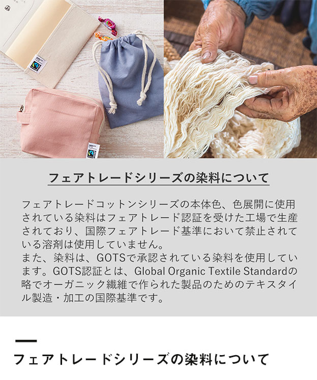「フェアトレードコットンA4フラットバッグ」は、A4サイズの冊子が入り、展示会や説明会ノベルティにもお薦めなコットントート。発展途上国の人々の支援に繋がる、フェアトレード認証のオーガニックコットンを使用しています。優しいカラー展開も魅力で、好感度の高い企業ノベルティや店舗販促品の特注製作にお薦めです。格安の値段でフルカラー名入れも可能ですので、ロゴやイラストプリントは当店にお任せ下さい。