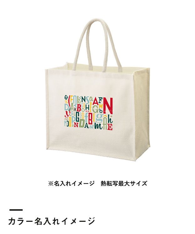 マチが広くたっぷり入る、大容量サイズの「ジュートスクエアトート(LL)」。天然素材となるジュートを使用し、ざっくりとしたナチュラルな素材感が魅力です。LLサイズは肩掛け使用が可能で、お買い物やレジャー用バッグはもちろん、収納用のインテリアとして自宅で使うのもお薦めしております。シンプルなロゴ入れもおしゃれな印象になりますので、ショッパーや販売品のパッケージ、購入ノベルティなどにぜひプリント作成をご利用ください。