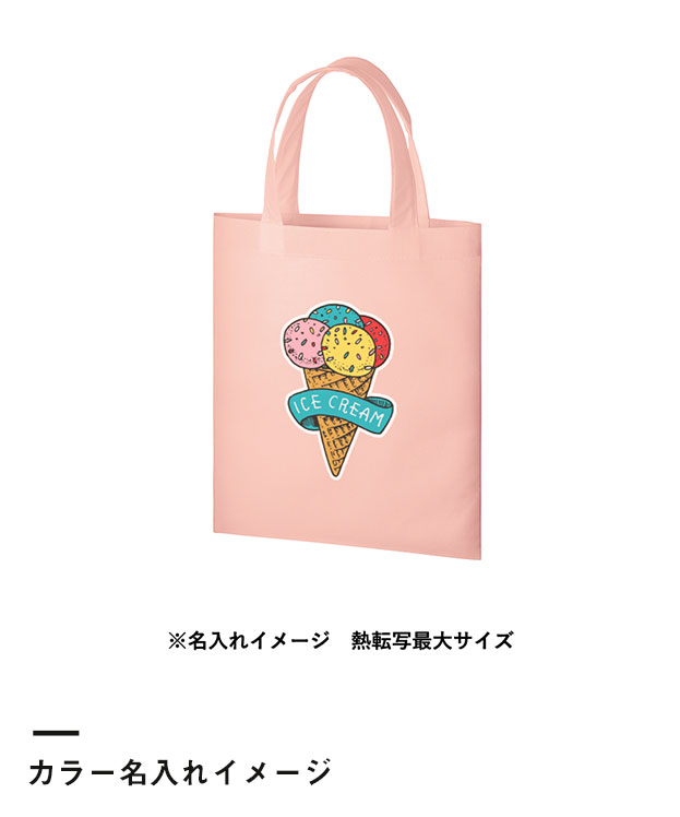 「再生不織布A4フラットトート」は、内側にエコマークタグが付いた、環境に優しい再生不織布素材のトートバッグ。マチのないフラット形状かつ持ち手が短いコンパクトタイプですが、A4サイズが収納できるため、激安価格の資料配布バッグ製作にお薦めです。フルカラー印刷にも対応しておりますので、企業ロゴ入りの展示会ノベルティや、学校名入りの説明会バッグなどのオーダーにぜひご活用ください。