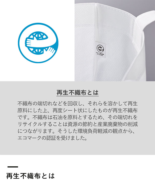 豊富な本体カラーも魅力の「再生不織布バッグ(M)」。不織布の端切れなどを回収して再利用した再生不織布使用のバッグで、本体内側にはエコマークタグも付いています。A4サイズがしっかり入り、肩掛けもできる定番人気の舟形タイプとなりますので、展示会や説明会の資料配布バッグには特にお薦め。軽量かつ激安なエコ不織布トートに企業ロゴなどをプリントし、格安ノベルティ製作にいかがでしょうか。