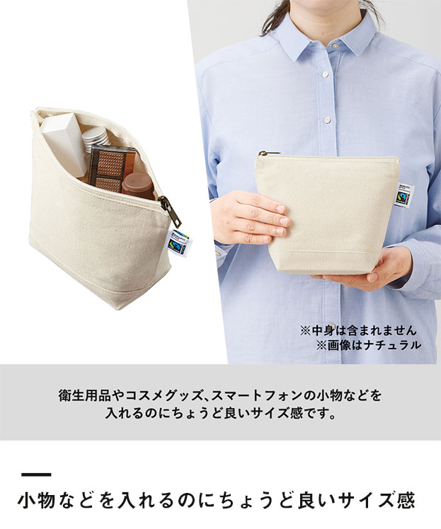 人気の舟形タイプで普段使いしやすい「フェアトレードコットンキャンバスデイリーポーチ(S)」。発展途上国の人々の生活支援に繋がるフェアトレードコットンを使用しており、SDGsの取り組みにも貢献できます。Sサイズはコスメやガジェットを入れるポーチにちょうどいいサイズです。下部のさりげない切り替えしデザインや、高級感のあるファスナーパーツなども魅力的。店舗ロゴやキャラクターイラストなどをプリント可能ですので、激安のイベント物販やオープンキャンバスのノベルティなどの特注作成にご活用ください。