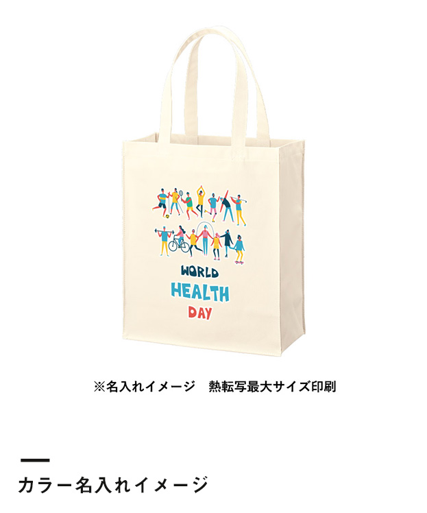 「再生PETユーティリティバッグ(L)」は、再生PET100%のポリエステル生地を使用した、大容量サイズのエコトート。肩掛けできる長めの持ち手と約140mmの広いマチで、たっぷりの荷物を安定して入れることができます。企業案件にもぴったりな優しい雰囲気のカラーも魅力ですので、展示会バッグやエコキャンペーンノベルティなど、様々な用途に名入れ製作をご活用ください。フルカラー印刷にも対応しております。