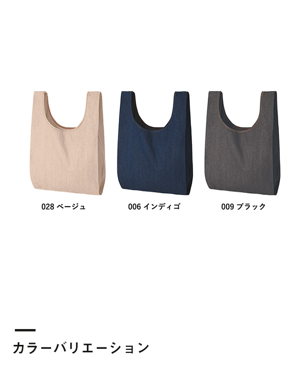 「デニムライクマルシェバッグ」は、環境に優しい再生ファブリック糸を綾織りにすることで、デニム調生地に仕上げたバッグ。間口が広く出し入れしやすいトレンドのマルシェ形状ですが、当商品は生地感の違いで他のマルシェバッグと差を付けることができます。店舗ロゴやイラストなどの特注プリントも承りますので、カジュアルに使えてエコなノベルティバッグ・販売エコバッグ製作にぜひご活用ください。