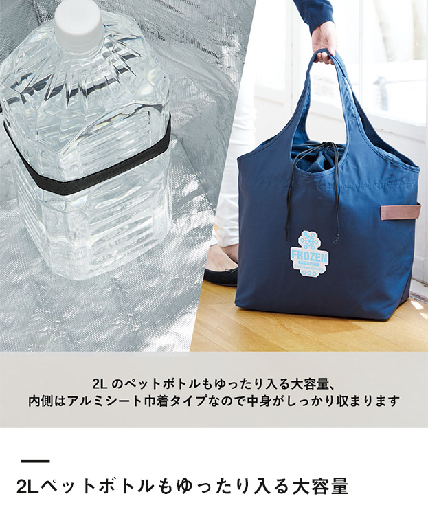 「クルリトクーラービッグマルシェバッグ」は、内側アルミシートで保冷効果がある、巾着タイプのマルシェ形状バッグ。2Lペットボトルもゆったり入る大容量で、レジかごに取り付けできるので、ファミリーの買い物や週末のまとめ買いに最適です。未使用時はゴム付きでくるっとコンパクトにまとまるので、持ち歩きにも◎。外側のベルトループは車からの荷降ろしにも役立ちます。店舗名入りの販売エコバッグや、不動産関連のキャンペーンギフトなどにぜひ名入れ作成をご利用ください。