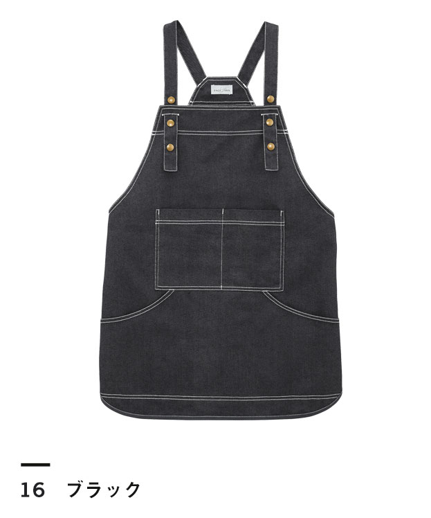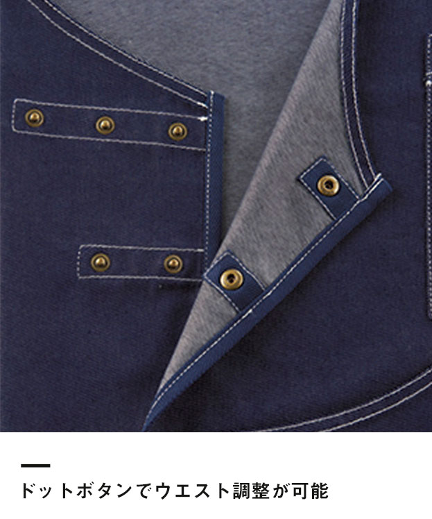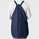 一見ハードな印象のデニム調ですが、コットンベースの柔らかなツイル素材を使用している「ビブスエプロン」。オーバーオール感覚で着用できるデザインが特徴的で、フロントはもちろんバッグもしっかり広範囲を守ります。サイドスリット入りなので動きやすく、肩紐とウエストはそれぞれドットボタンでサイズ調整を行うことが可能です。仕切りが便利なフロントポケットに加えて、両脇に間口の大きな斜めポケットもあり、メモ帳やタオルなどもらくらく収納可能。グリーンインテリアショップやアウトドア系ショップなどのタフな店舗制服のオリジナル注文にいかがでしょうか。