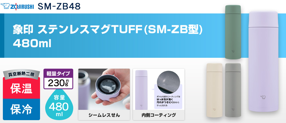 「象印 ステンレスマグTUFF(SM-ZB型) 480ml(SM-ZB48)」は「象印 ステンレスマグ(SU-AA型) 480ml(SU-AA48)」へ仕様向上しリニューアル致しました。