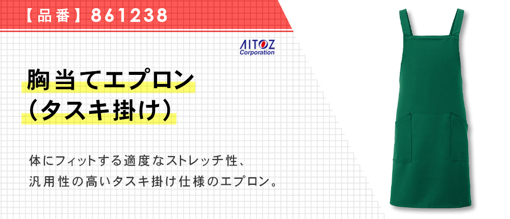 「胸当てエプロン(タスキ掛け)」は、汎用性の高いタスキ掛け仕様のエプロン。適度なストレッチ性で体にフィットし、作業用エプロンの特注製作に最適です。肩紐クロス部分にはズレを防止する安定ループ付き、右ポケット内側にはペン差しポケット付きなど、リーズナブルながら使いやすい機能も豊富。名入れ製作も可能ですので、接客業やキッチンスタッフ、工場など様々な場面でご活用ください。