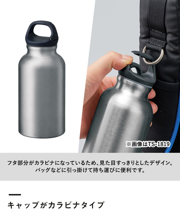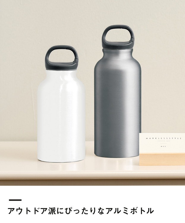 「アルミハンギングボトル(M)」は、カラビナタイプのキャップをリュックなどに引っ掛けて持ち運べる便利なボトル。コンパクトサイズの400ml容量で、アウトドアにもちょっとした外出にも重宝します。シンプルでかっこいい本体カラーからお選び頂き、店舗ロゴや企業名を印刷製作いたしますので、アウトドアツアーの参加記念品やイベント物販などにいかがでしょうか。