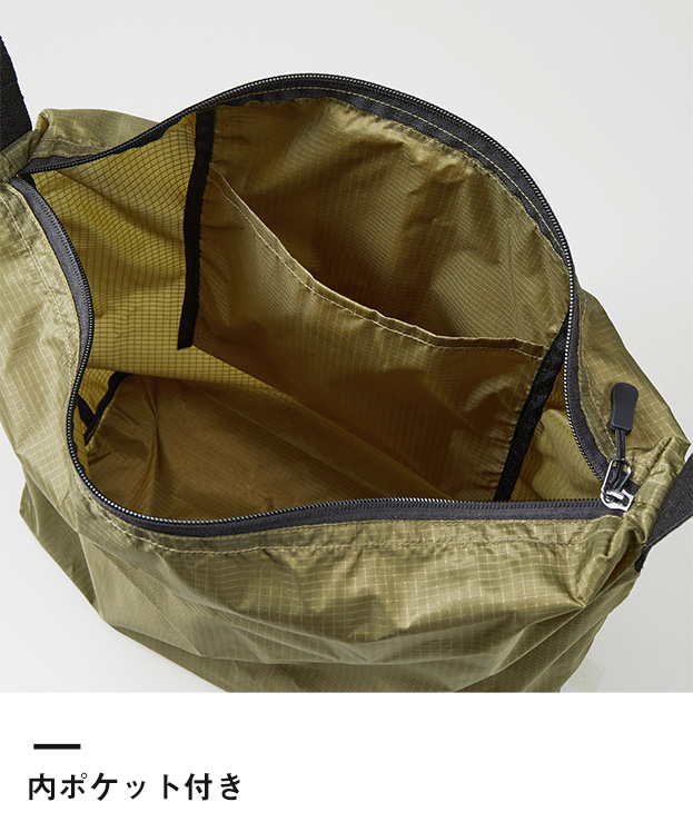 「ライトナイロン リップストップ ショルダーバッグ」は、軽くて丈夫なリップストップ生地で作られたショルダーバッグ。薄手ながらハリコシがあり、ショルダーテープはアジャスターで長さ調節が可能で使い勝手抜群です。サイクリングなどのスポーツシーンでも体にぴったりフィットさせて使うことができるほか、大容量なのでシティーユースにも◎。ブランド名入りのショップ販売バッグや、イベントロゴ入りの物販グッズ製作にいかがでしょうか。