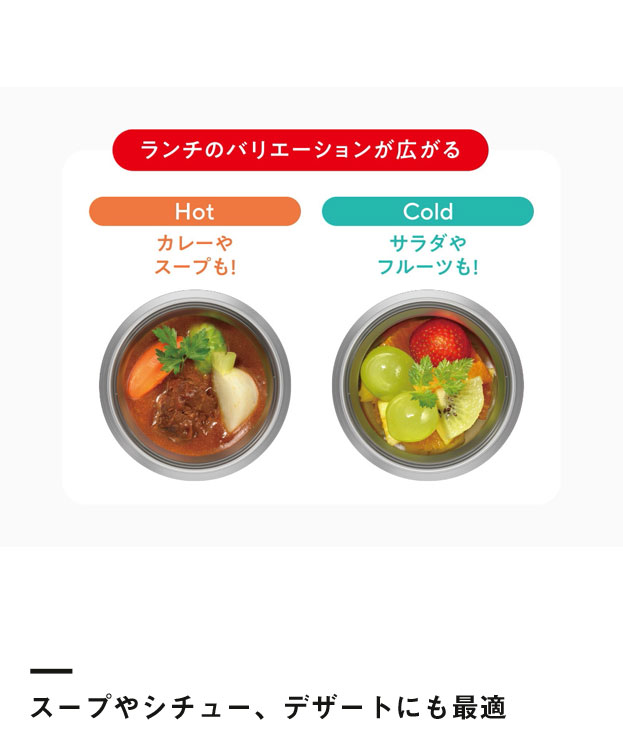 「サーモス 真空断熱スープジャー 300ml/JEB」は、本体もフタも丸ごと食洗機OKな保冷・保温スープジャー。フタはパーツが分かれるので隅々まで洗えて、蓋を少し回すと中の圧力が逃げるクリック構造で開けやすさも魅力的。コンパクトな300ml容量はコップ一杯程度のスープやデザートの持ち運びに最適です。格安価格で企業やブランドロゴ印刷を承りますので、成約記念品や販売グッズ制作にいかがでしょうか。