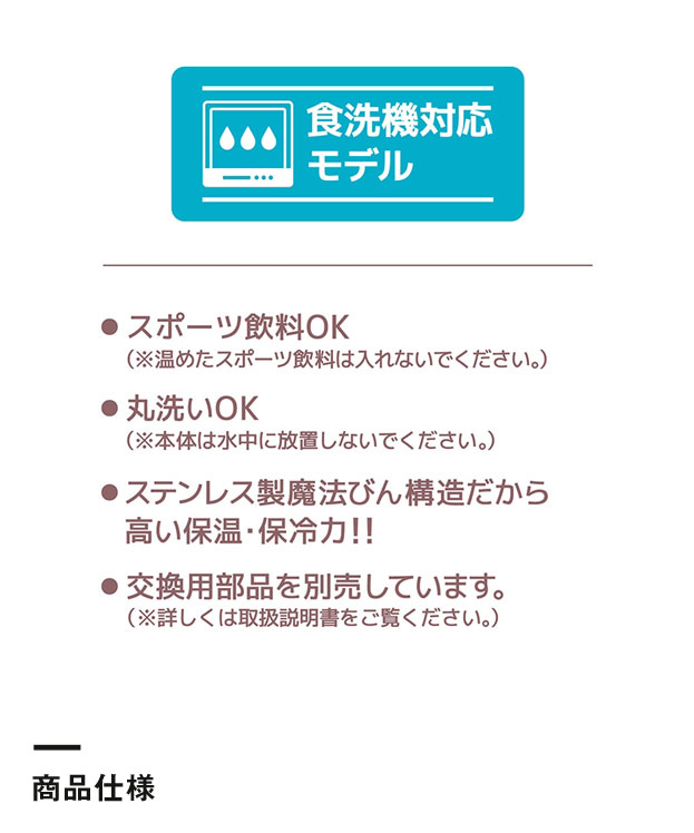 ※保温・保冷効力とは、室温20℃±2℃において製品に熱湯(4℃以下の水)をフタ下端まで満たし、湯温が95℃±1℃(4℃±1℃)のときからフタを付けて縦置きにした状態で6時間放置した場合におけるその水の温度です。