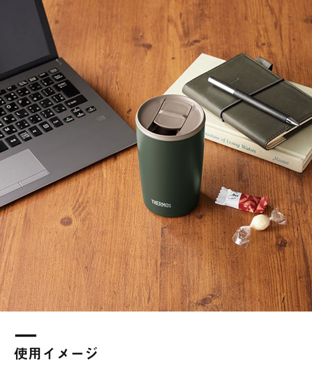 「サーモス 真空断熱タンブラー 400ml/JDP」は、ステンレス製魔法びん構造で保温・保冷が長持ちするタンブラー。飲み口が簡単に開閉できるスライド式のフタが便利で、ほこりを防いで保温にも効果的です。また、シンプル構造でお手入れしやすく、全パーツ食洗機もOK。氷を入れてもたっぷり飲める400ml容量でデスク使いにもお薦めですので、企業ロゴ入りの社員向け記念品や、ご契約記念品などにオリジナル作成はいかがでしょうか。