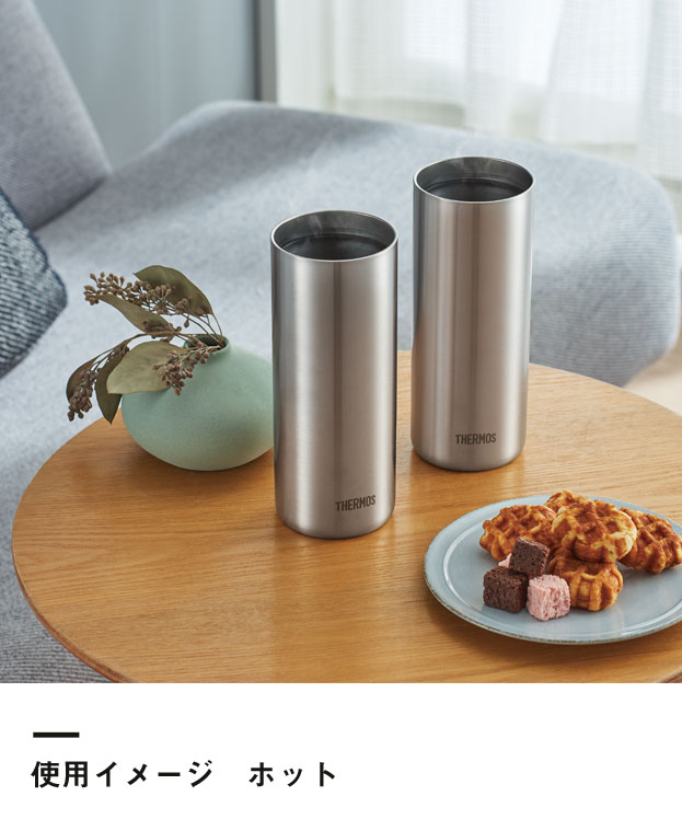 サーモス 真空断熱タンブラー 600ml/JDWシルバーは、おいしさが長持ちするステンレス製魔法びん構造のタンブラー。氷が長持ちするので飲み物が薄まりにくく、結露もしにくい商品です。また、外側が熱くならないので熱々の飲み物を入れても快適となっております。約170gの軽量タイプで、シンプルなシルバーカラーで男女問わずご活用頂けます。社名や店舗ロゴの名入れ制作もぜひご活用ください。