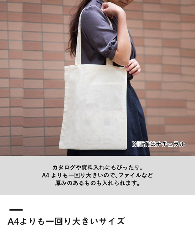 持ち手が長く肩掛けがスムーズなトートバッグの「オーガニック厚手コットン フラットショルダートート」になります。A4サイズより一回り多きなサイズ感は、シーンを選ばずに使用可能です。オーガニックコットンを使用した生地は5オンスを程良い厚さで、中身が透けてしまう心配もありません。展示会の来場記念品やライブの物販グッズ製作などにいかがでしょうか。
