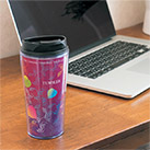 「シールタンブラー360ml」は、タンブラーとクリア素材の容器の間にフルカラープリントのオリジナル台紙を入れ込める名入れ専用商品になります。Sサイズのドリンクカップの同等の容量360mlサイズは、テイクアウト用のマイタンブラーにも最適です。飲み口にふたが付いていて、携帯していただく事で名入れプリントの注目度が高まります。店舗ノベルティ、ライブの物販グッズなどの格安製作にご活用下さい。