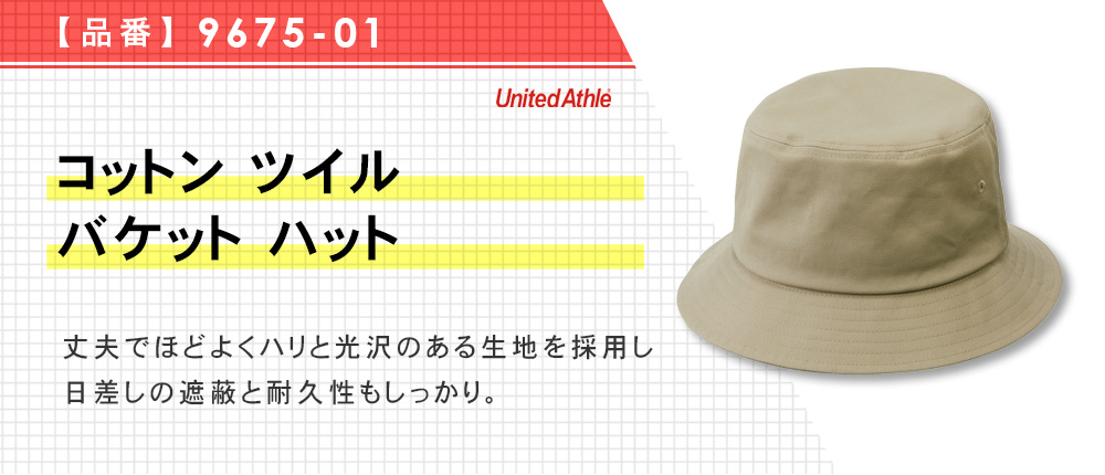 綿を100%使用しており、見た目も肌触りも柔らかなデザインのハットです。ツイル生地で程良いハリと光沢があるのも特徴的なアイテムです。ツバが周囲についているので、日差しを避けるのにもピッタリな商品です。シンプルな見た目ですので、どなたにでも使いやすいバケットハット。夏のオリジナルグッズとして刺繍作成すれば、実用的な商品として多くの方にご活用頂けるでしょう。