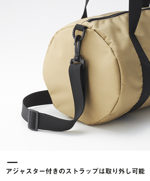 再生ポリエステルを100%使用して作成された「リサイクルポリエステル ドラムバッグ」です。かさばる荷物を収納しやすいドラム形状のバッグは、レジャーや日帰り旅行など荷物の多いお出かけに役立ちます。手持ちとショルダーの2WAY仕様で、服装や用途に合わせて使用できるのが便利です。正面中央にブランド名やロゴなどを印刷し、アパレルの購入特典ノベルティやライブグッズのオリジナル制作にご活用下さいませ。