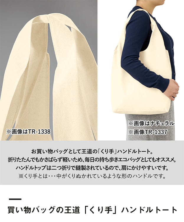 「厚手コットンショルダーハンドルトート(M)」は、肩掛けもできるくり手デザインのトートバッグになります。適度な厚みのあるコットン生地は軽量で折りたたんでもかさばらず、持ち運び用のエコバッグにも最適です。本体へのオリジナル名入れは、フルカラープリントや刺繍のオーダーメイドも承っております。スーパーの周年ノベルティや雑貨店の物販グッズなどに当通販店でのオーダーメイドをご検討下さい。