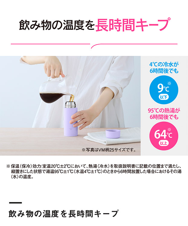 - ※保温・保冷効力とは、室温20℃±2℃において製品に熱湯(4℃以下の水)を取り扱い説明書に記載の位置まで満たし、湯温が95℃±1℃(4℃±1℃)のときから縦置きにした状態で6時間放置した場合におけるその水の温度です。