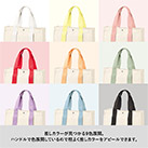 「キャンバスカラーハンドルスクエアトート」は、リボンのような長いハンドルがアクセントのスクエア型トートバッグです。白いキャンバス地をベースとし、ハンドル部分の豊富なカラー展開が、推し活関連の名入れグッズや記念品のオリジナル製作にぴったり。アーティストのロゴやアニメ作品のタイトルなどを格安プリントできますので、ライブイベントやグッズショップで販売する物販の製作にいかがでしょうか。