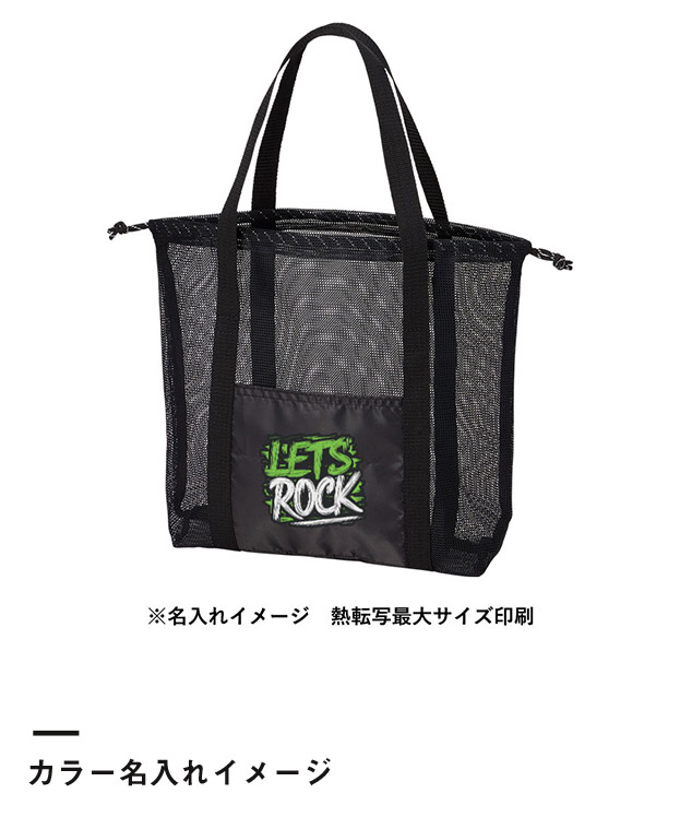 「メッシュライントート(L)」は、透け感のあるメッシュ素材がトレンドを抑えたトートバッグ。中身が飛び出さないよう、口は巾着仕様になっています。バスタオルやビーチサンダルなどが入る大容量のLサイズは、サウナや水辺のレジャーにも最適です。スマホが収納できる外ポケットには、イベントロゴや店名などの激安プリントを承ります。イベントの参加記念品やアパレルの購入特典ノベルティなどにいかがでしょうか。