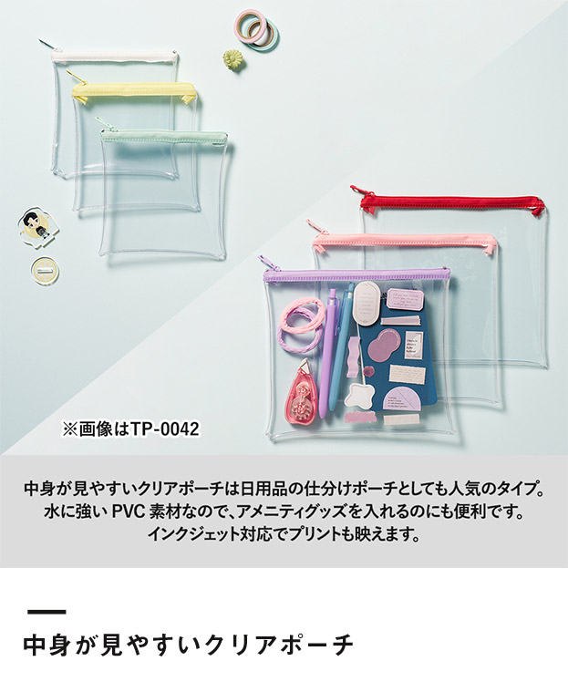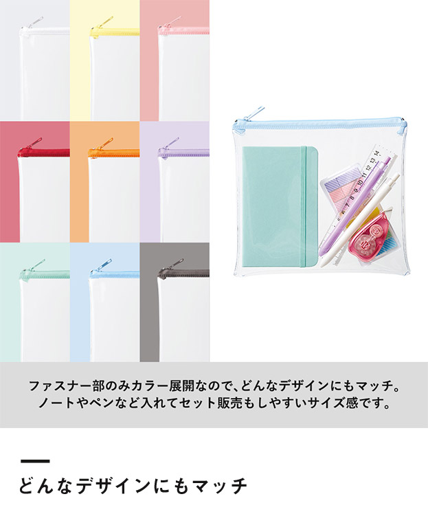 「カラーファスナークリアポーチ(M)」は、シンプルなクリア素材が多種多様な名入れデザインにマッチするオーダーメイド製作にうってつけのポーチ。カラフルなファスナーがアクセントになっていて、アイドルやブランドのイメージカラーに合わせて色をお選びいただけます。大きめのMサイズは、文房具や推しグッズの収納にぴったりです。キャラクターショップのノベルティやライブイベントで販売するグッズなどの特注製作にぜひ。