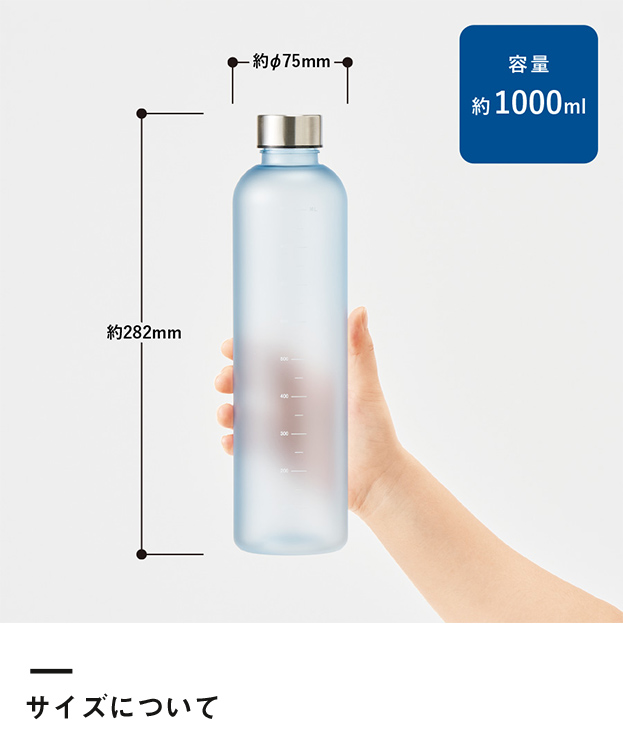 フロストグラスのような半透明のボディがおしゃれな「目盛り付フロストボトル1000ml」には、中身の残量がわかる目盛りが付いています。たっぷり飲める1000mlの大容量サイズは、水分の補給量を目で見て確認できるのがポイント。美容や健康を意識した名入れグッズとして、フィットネスジムのノベルティや美容サロンの入会記念品などにお薦めです。