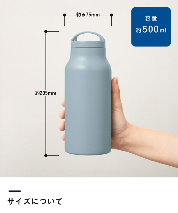 牛乳瓶のようなコロンとしたフォルムの「Handitシンプルサーモボトル500ml」は、フタにハンドルが付いた持ち運びやすいステンレスボトルです。外出先での水分補給に十分な容量500mlサイズは、バッグに入れずそのまま持ち運ぶことでオフィス間やジム内の移動がスムーズになります。氷も入る広い口径には、パッキンと一体化した氷止め付き。従業員への贈答品や店舗の周年記念品などにいかがでしょうか。
