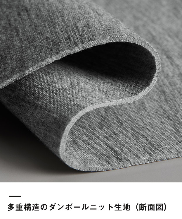 「9.4オンス T/R ダンボールニット パンツ」は、生地の中に空気層を含んだ段ボールニット生地のパンツ。保温性に優れていながら軽量感もあり、快適にご着用いただけます。裾口にはリブではなく二本針始末を採用しており、シルエットに野暮ったさが無くシティユースにもお薦めです。スポーツジムのオリジナルトレーニングウェア、ライブの特注ウェアといったプリント制作にぜひご検討下さい。