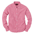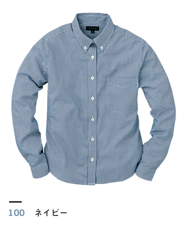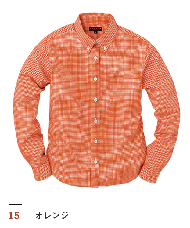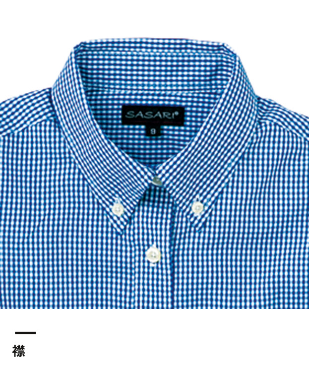 襟元にボタンダウンを採用したギンガムチェック生地のレディース用ワイシャツになります。安価な値段のオリジナル制作や、名入れ印刷などにも対応していますので、ノベルティ関連の物販グッズやイベントスタッフ用Yシャツとしても数多くご注文いただき、販売しています。