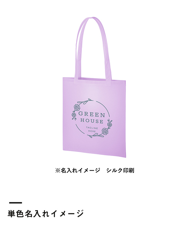 長い持ち手が特徴のショルダートートバッグ。不織布で製作されている為、軽量でコストパフォーマンスに優れた激安価格で作成が可能となるモデルです。プリント面も広くデザイン映えするオリジナルトートバッグを作る事が出来、ブランディングなどに最大限効果を発揮します。
