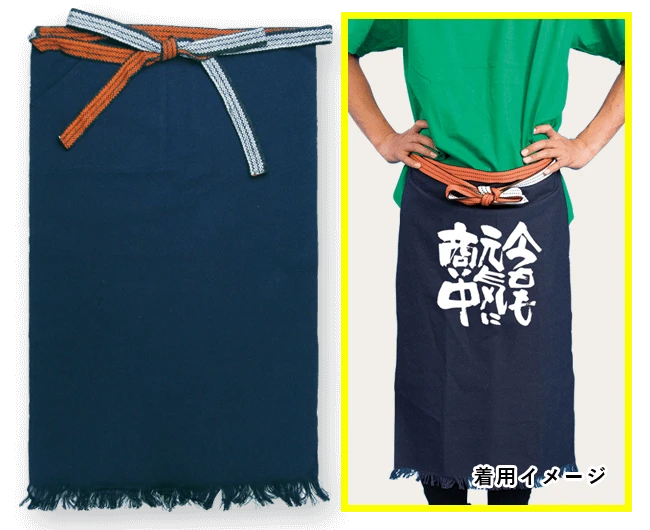 酒屋・米屋などで見られる事の多い帆前掛けのロングタイプ。こちらも商品もプリントを施し激安価格でオリジナル作成いたします。
