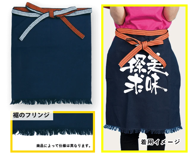 酒屋や居酒屋などの和店舗制服にお薦めの、ロングタイプの帆前掛け。ロゴやメッセージの名入れ作成が人気です。